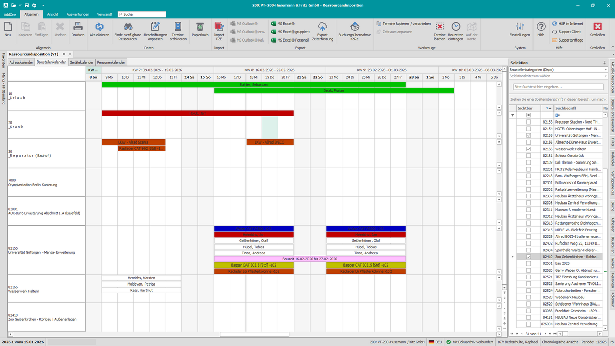 Die Erweiterungsmodule verbinden Büro und Baustelle durchgängig: Tagesberichte, Fotos und Aufmaße werden vor Ort erfasst und direkt dem Projekt zugeordnet. Die Ressourcenplanung verteilt Kolonnen und Geräte im Kalender, während das Cockpit Termine, Aufgaben und offene Punkte bündelt. So entstehen strukturierte Nachweise, transparente Abläufe und eine verlässliche Entscheidungsgrundlage.
