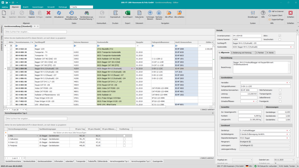 Einzel-, Mengen- und Leistungsgeräte werden strukturiert verwaltet und sind vollständig in die Kosten- und Leistungsrechnung integriert. Verrechnungen nach BGL, BAL oder individuellen Sätzen lassen sich flexibel abbilden. Über die Disposition planen Sie Standorte, Einsatzzeiten und Ressourcen transparent. Gerätekonto, Wartungsübersichten und Lebenslaufakten sichern die Nachvollziehbarkeit über Nutzung, Zustand und Kostenentwicklung. Variable Layouts, PDF-Ausgaben sowie Excel-Import und -Export bieten zusätzliche Flexibilität in der Dokumentation. Alle relevanten Stammdaten – von Projekten bis Artikeln – stehen zentral zur Verfügung.