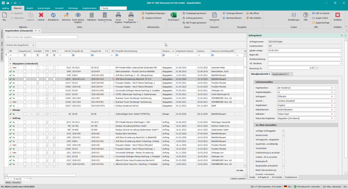 Auswertungen sind nach frei definierbaren Kriterien möglich, z. B. Region, Sparte, Auftraggeberart oder Zeitraum. Damit lassen sich Kennzahlen wie Angebotsquote (Hit-Rate) und Erfolgsraten in der Akquise nachvollziehen.