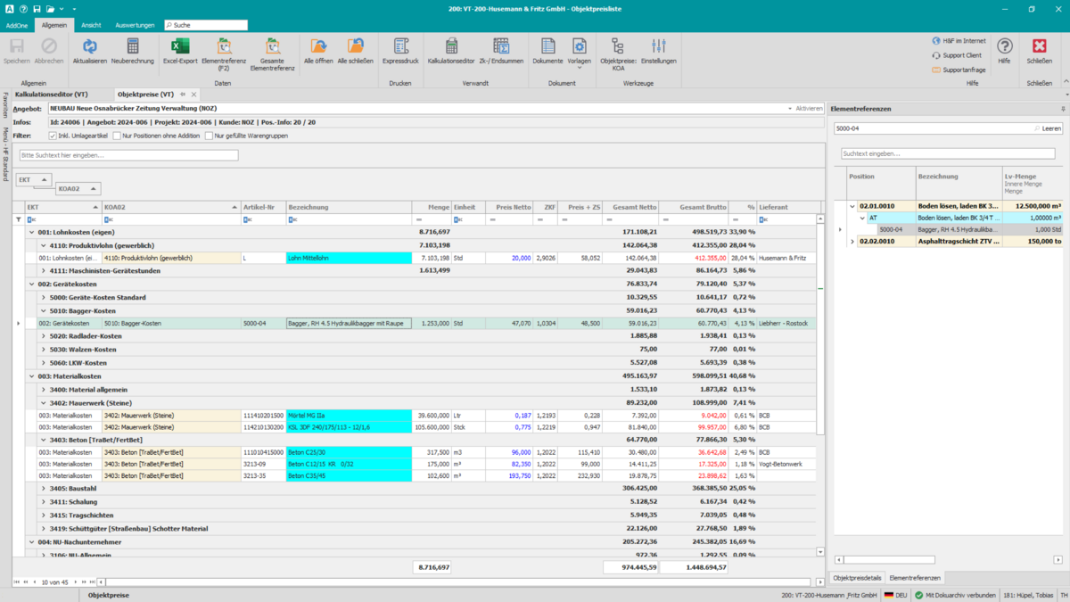 Das Modul unterstützt unterschiedliche Verfahren wie Zuschlagskalkulation, Endsummenkalkulation und Einzelpreis-Kalkulation. Dadurch können je Projekt oder Gewerk passende Kalkulationslogiken abgebildet werden – inklusive Eigenleistung und Nachunternehmerleistung.