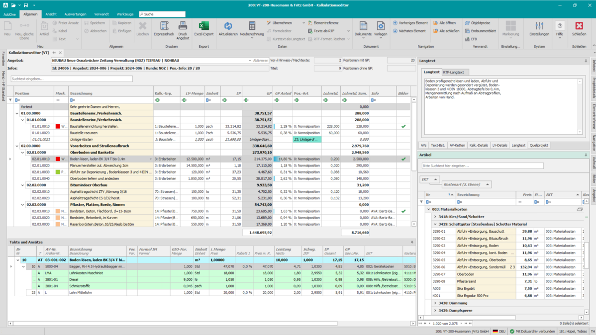 Die Angebotskalkulation unterstützt Kalkulatoren und Bauunternehmen dabei, Angebote schnell und verlässlich zu erstellen. Alle Schritte – vom LV-Import bis zur Preisbildung – laufen in einer durchgängigen Systemumgebung für Hochbau, Tiefbau, TGA und weitere Gewerke.